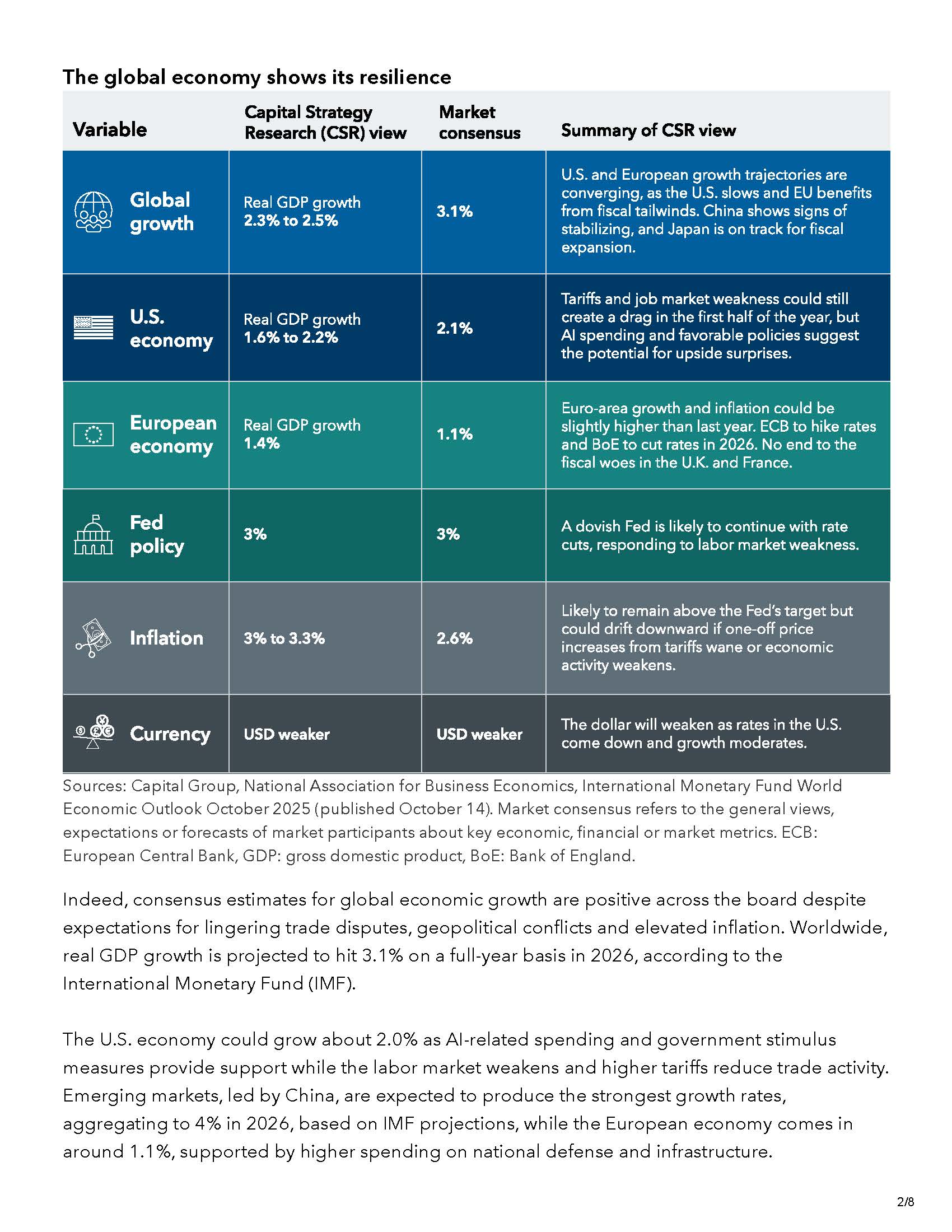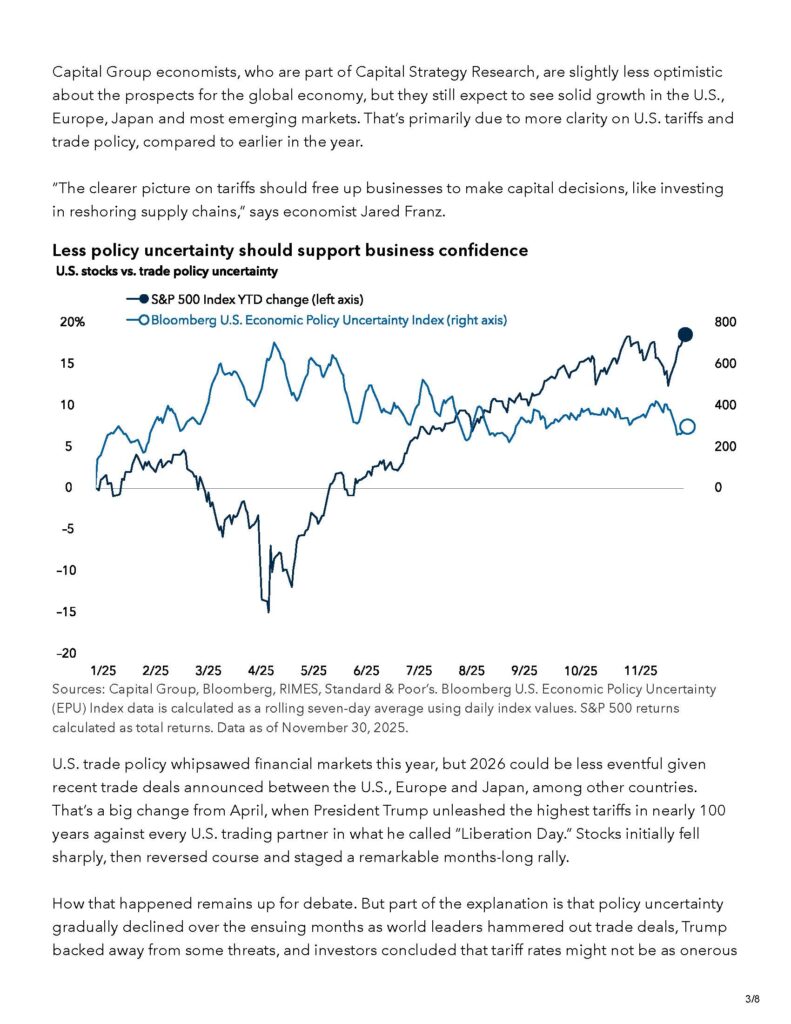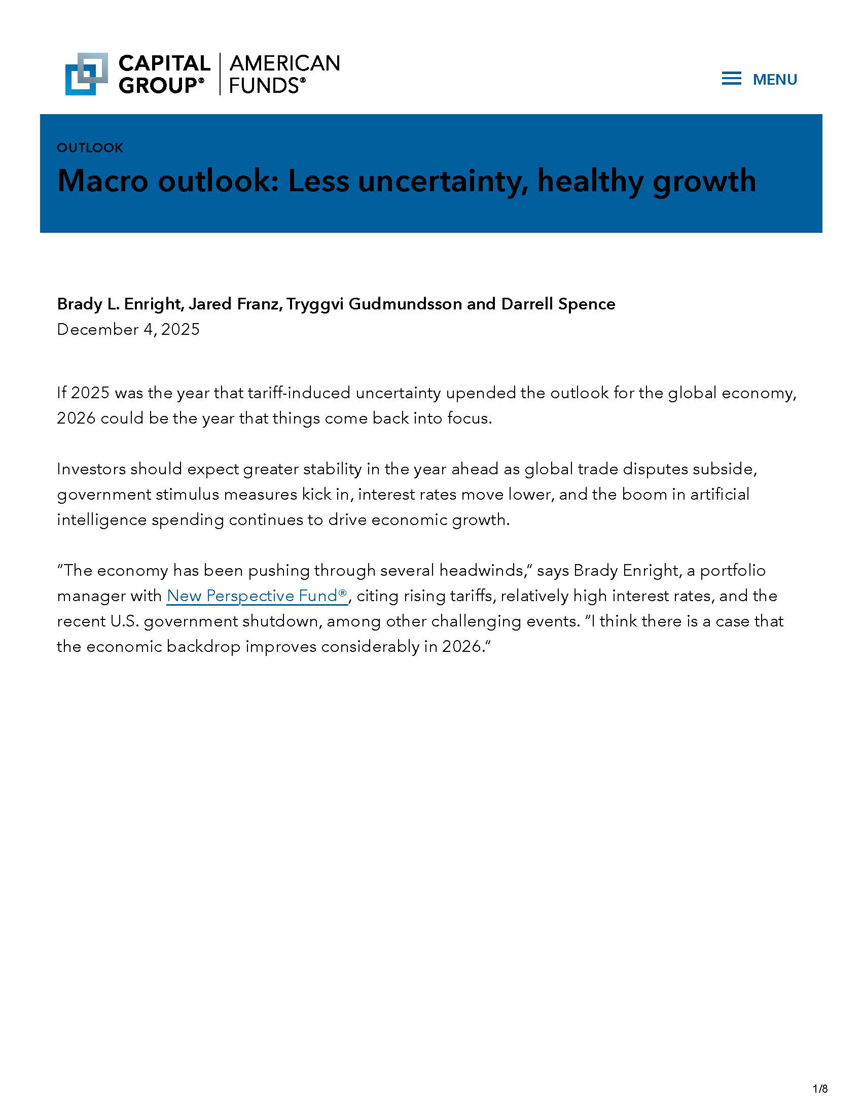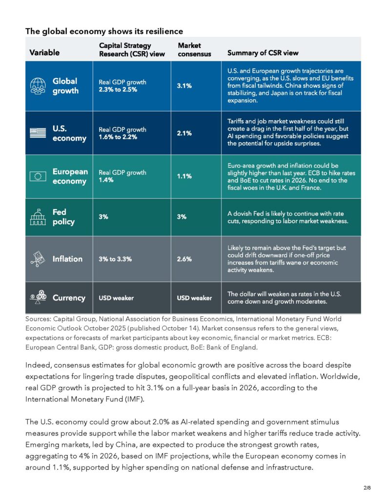 Capital Group 2026 Economic Outlook December 8, 2025 by Paul Myers, Myers Capital Management Capital Group is one of the Portfolio Strategists we utilize for client accounts. Following is an article which gives their overall views for the economy in 2026, which is fairly positive.
