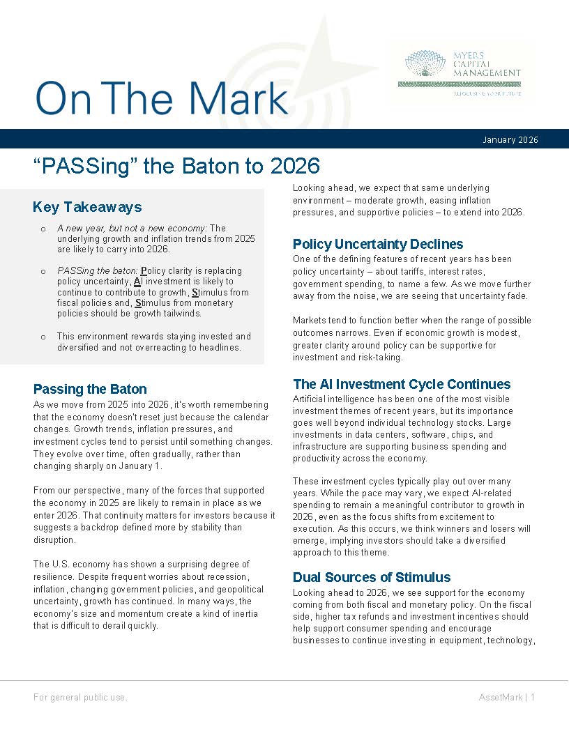 “PASSing” the Baton to 2026 January 22, 2026 by Paul Myers, Myers Capital Management January’s Issue of “On The Mark” discusses what is likely ahead for the economy this year as we have turned from 2025 to 2026 and what this means to investors…