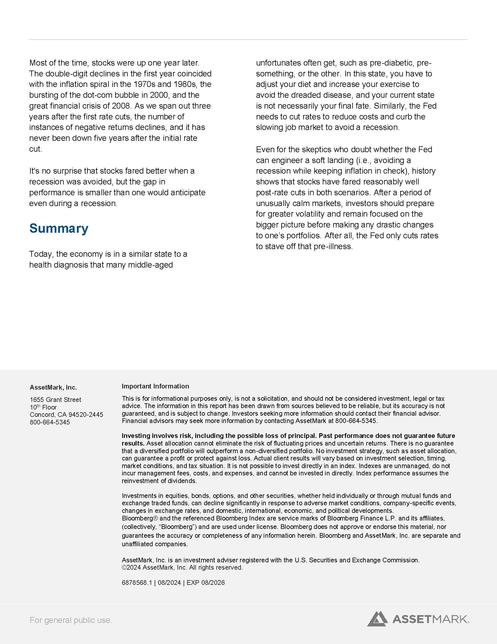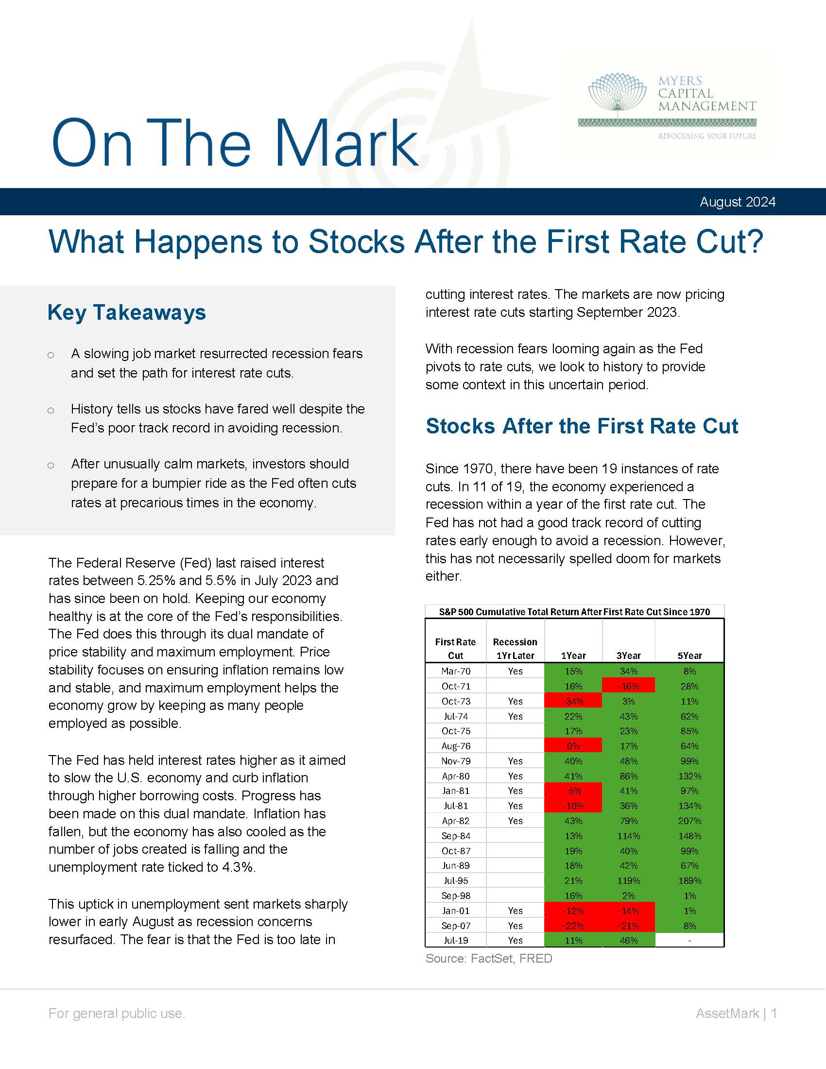 With inflation lowering and July unemployment a bit higher, many expect the Fed to begin lowering interest rates soon. This month’s issue of “On the Mark” discusses what historically has happened to stocks when the Fed starts lowering rates.