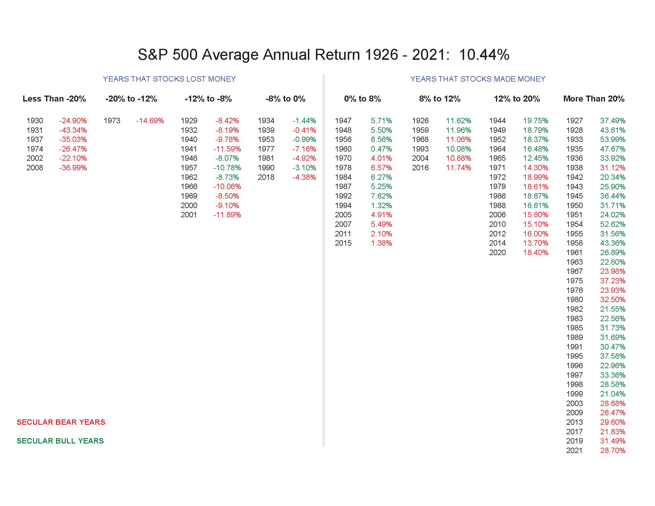 Question 1… These are typical ranges of returns one should expect to experience most the time and not the best and the worst each risk profile could be. There are outliers on the upside and downside. The risk profile all the way on the right is a 100% stock portfolio, and as you go left there is progressive less in stocks. For the 100% stock portfolio, the chart below shows that there are rate of return outliers on the left (larger than typical losses) and right column (larger than typical gains), and you can also see that there are significantly many more years that stocks are up than down and that therefore by being willing to take more risk there is the potential of making more in your portfolio. But you must be comfortable with the typical ranges of returns.